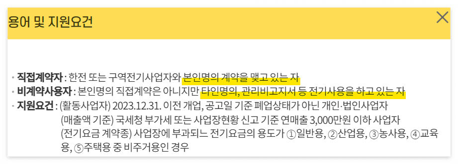 지원: 직접계약자는 대상자 통지 이후 최초로 발행되는 전기요금 고지서부터 전기요금 차감이 적용되며, 비계약사용자는 대상자 통지 후 5일 이내 (영업일 기준) 전기요금 납부금액 환급