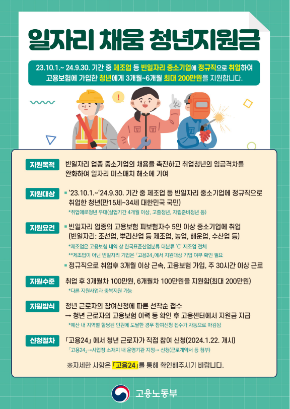 23.10.1~24.9.30 기간 중 제조업 등 빈일자리 중소기업에 정규직으로 취업한 청년 (만 15세~34세 대한민국 국민)으로 3개월 이상 근속