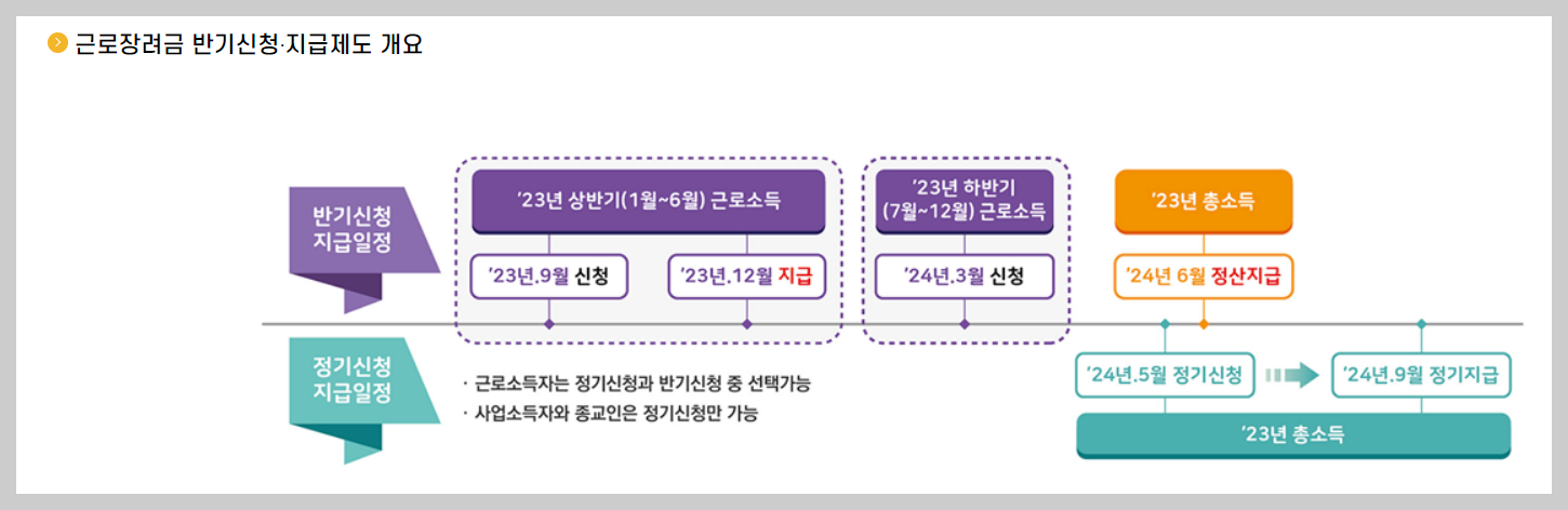 소득 발생시점과 장려금 수급시점 간 시차가 크게 발생하는 기존 장려금 지급제도의 단점을 보완하고 장려금 지원의 실질적인 체감도를 높이기 위하여, 반기별 소득파악이 가능한 근로소득자에 한하여 당해연도 소득을 기준으로 근로장려금을 반기별로 신청·지급할 수 있도록 2019년부터 시행된 제도입니다. 정기 지급방식과 반기 지급방식 중 선택하여 신청 가능(반기신청은 기한 경과 후 신청불가)