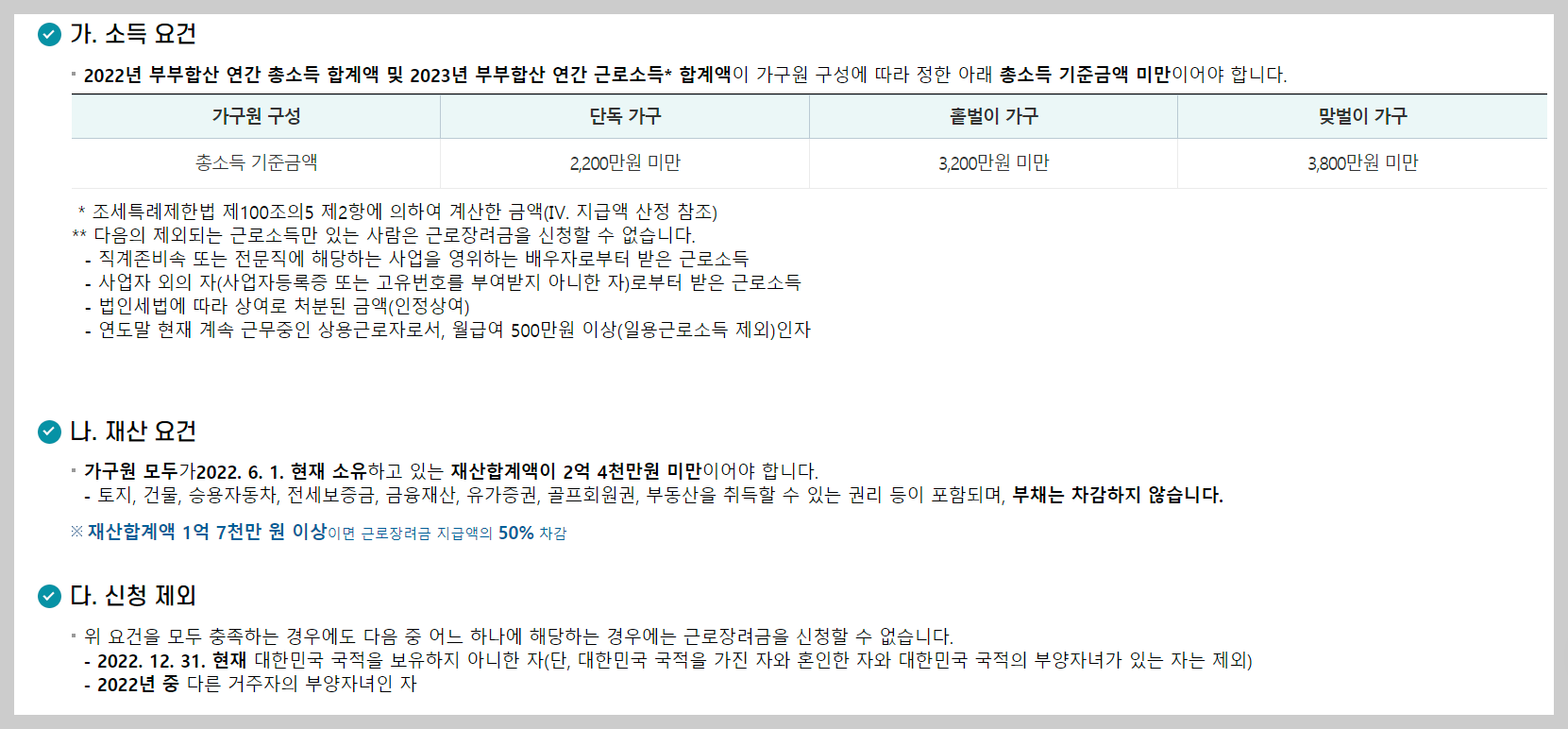2023년에 본인과 배우자의 소득이 근로소득으로만* 구성된 거주자로서, 아래의 요건을 모두 충족하는 경우 근로장려금 반기신청을 선택할 수 있습니다.