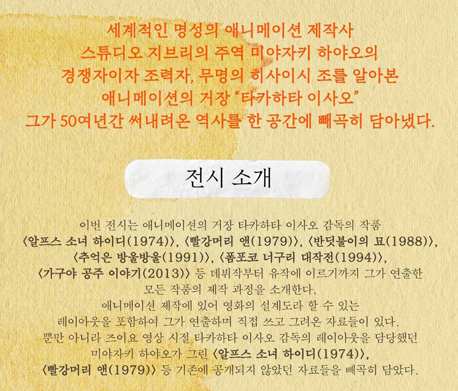 일본 애니메이션 제작사 스튜디오 지브리의 설립 주역인 ‘타카하타 이사오(高畑 勲)’ 감독의 작업실을 고스란히 엿볼 수 있는 전시회를 4월 26일부터 8월 3일까지 세종문화회관 미술관 1, 2관에서 개최한다고 합니다.