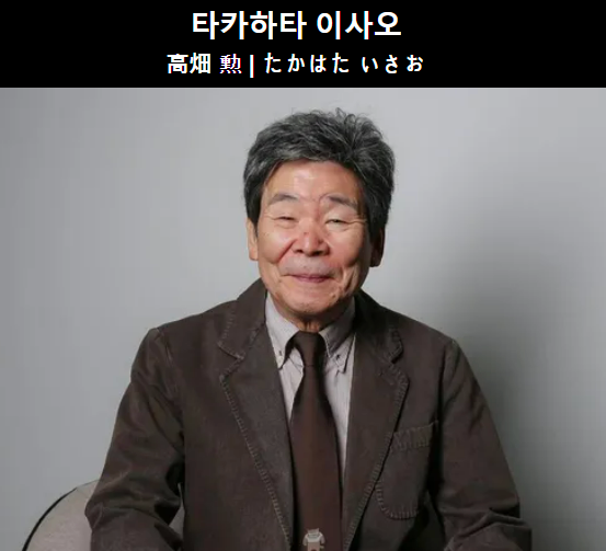 타카하타 감독은 지브리 스튜디오를 설립한 애니메이션 감독 중 한 명으로 1970년대 텔레비전에서 방영되었던 세계 명작 애니메이션 ‘빨강머리 앤(1979) ’, ‘알프스 소녀 하이디(1974) ’등을 제작, 연출한 인물입니다. 미야자키 하야오, 스즈키 토시오와 함께 1985년 스튜디오 지브리를 설립 후 장편 애니메이션 영화 ‘반딧불의 묘(1988) ’, ‘추억은 방울방울(1991) ’, ‘폼포코 너구리 대작전(1994) ’, ‘가구야 공주 이야기(2013) ’등 많은 명작을 남겼어요.
